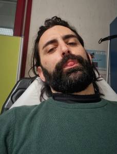 Mi metto a sedere sul lettino incrociando le gambe e approfitto del tempo a disposizione per scrivere qualche appunto di lavoro sul cellulare che scambio con i miei colleghi: devo completare un lavoro importante in vista di un evento del prossimo mese a cui tengo tanto. Sono assorto e concentrato, quasi del tutto estraniato dal contesto. Sento solo un leggero fastidio alla nuca dovuto alla botta successiva alla caduta, ma nulla di che, non ci faccio nemmeno caso. Approfitto anche dell’attesa per inviare una foto stupida attraverso cui provare a tranquillizzare in qualche modo, parenti e colleghi (anche se non bella, la riporto qui sotto come testimonianza fotografica ).