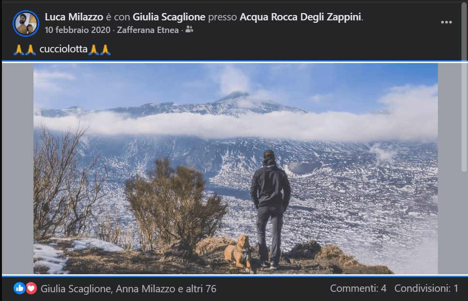Quel giorno Giulia lavorava, io presi Roger e ci andammo a fare una piccola escursione etnea; andammo ad Acqua Rocca degli Zappini, da cui si gode di una vista meravigliosa. Andai lassù per rivolgere una preghiera a “Mamma Etna”. Sentivo una forza a livello spirituale, un qualcosa tra il cristiano ed il pagano allo stesso tempo, non so….fatto sta, che da li in poi, sostanzialmente, tu hai iniziato ad essere tra di noi, tra i nostri pensieri.